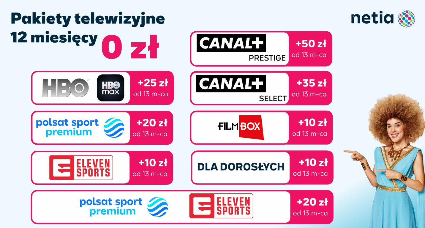 Prezentowana oferta Netii S.A.: „Wybierz rabat 12 mies.” obowiązuje przy zawarciu Umowy na czas określony 24 pełnych Okresów Rozliczeniowych przy jednoczesnym korzystaniu z rabatów za e-fakturę (5zł) i zgody marketingowe (5zł). W przypadku rezygnacji lub niespełnienia warunków przyznania rabatów, cena wzrośnie o 10 zł. Wraz z pierwszą fakturą zostanie naliczona opłata aktywacyjna w wysokości 79 zł za Internet i 2 zł za Telewizję. Po 24 miesiącach cena abonamentu wzrasta o 10 zł. Szybki Internet Max (1000, 2000) stanowi wyłącznie nazwę marketingową. Usługa Internetowa oparta jest na parametrach jakości wynikających z maksymalnych parametrów technicznych danej technologii, w jakiej świadczona jest Usługa Internetowa lub wynikających z ofertowych ustawień technicznych łącza. Prędkość 2 Gb/s jest dostępna na technologii PON. Parametry świadczenia Usługi Internetowej, w szczególności parametry prędkości oraz wpływu innych Usług na Usługę Internetową, dostępne są na stronie netia.pl. Oferta jest ograniczone terytorialnie do zasięgu stacjonarnej sieci PON, HFC, ETTH Operatora.